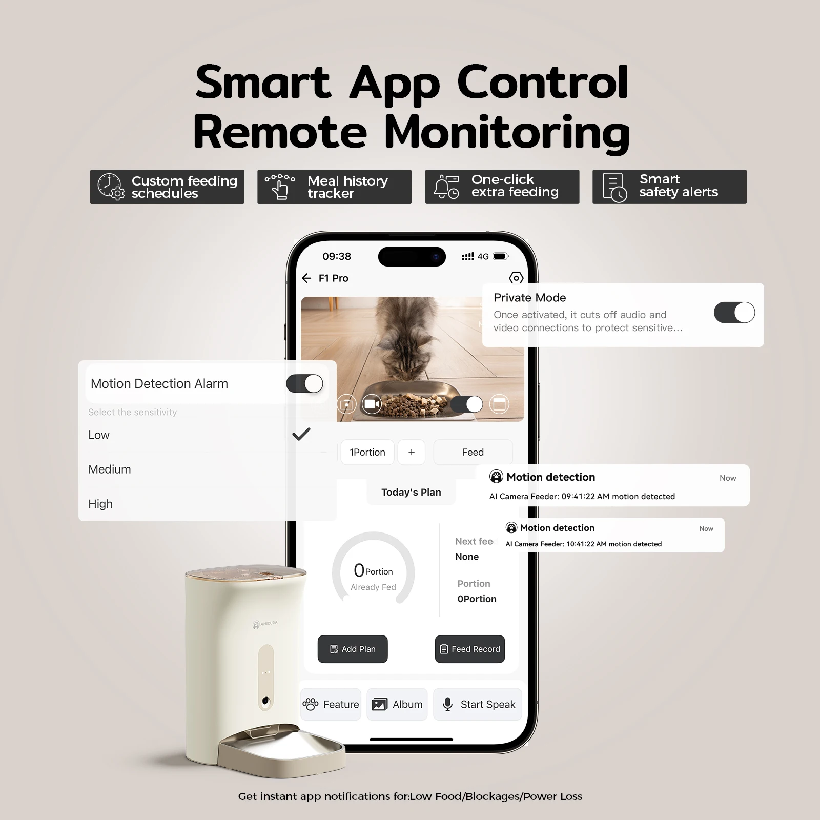 Real‑time alerts for low food, clogging, or power failure