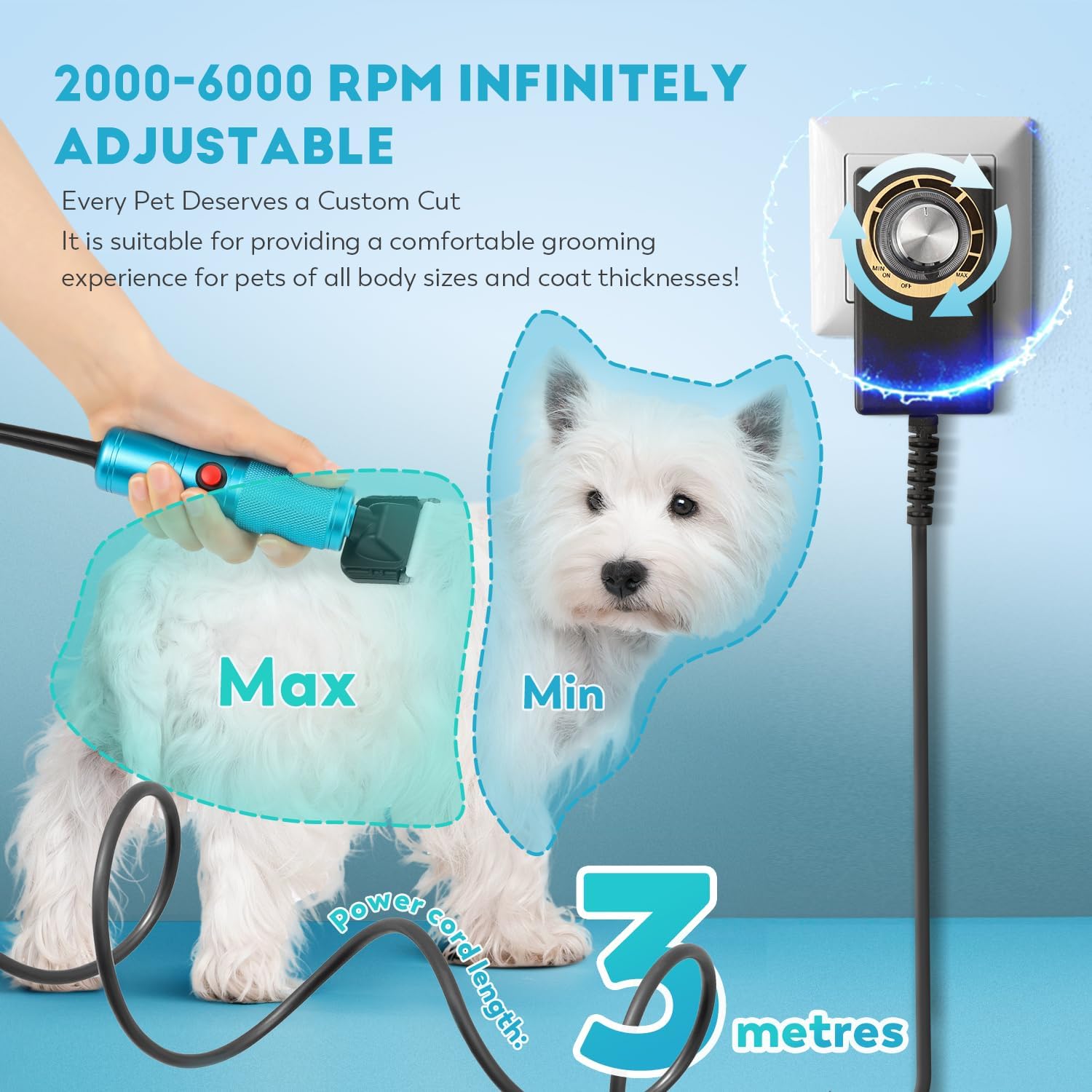 • Adjustable speed from 2000–6000 RPM: stepless control for trimming pets with thin, medium or thick coats; strong motor prevents clogging or pulling