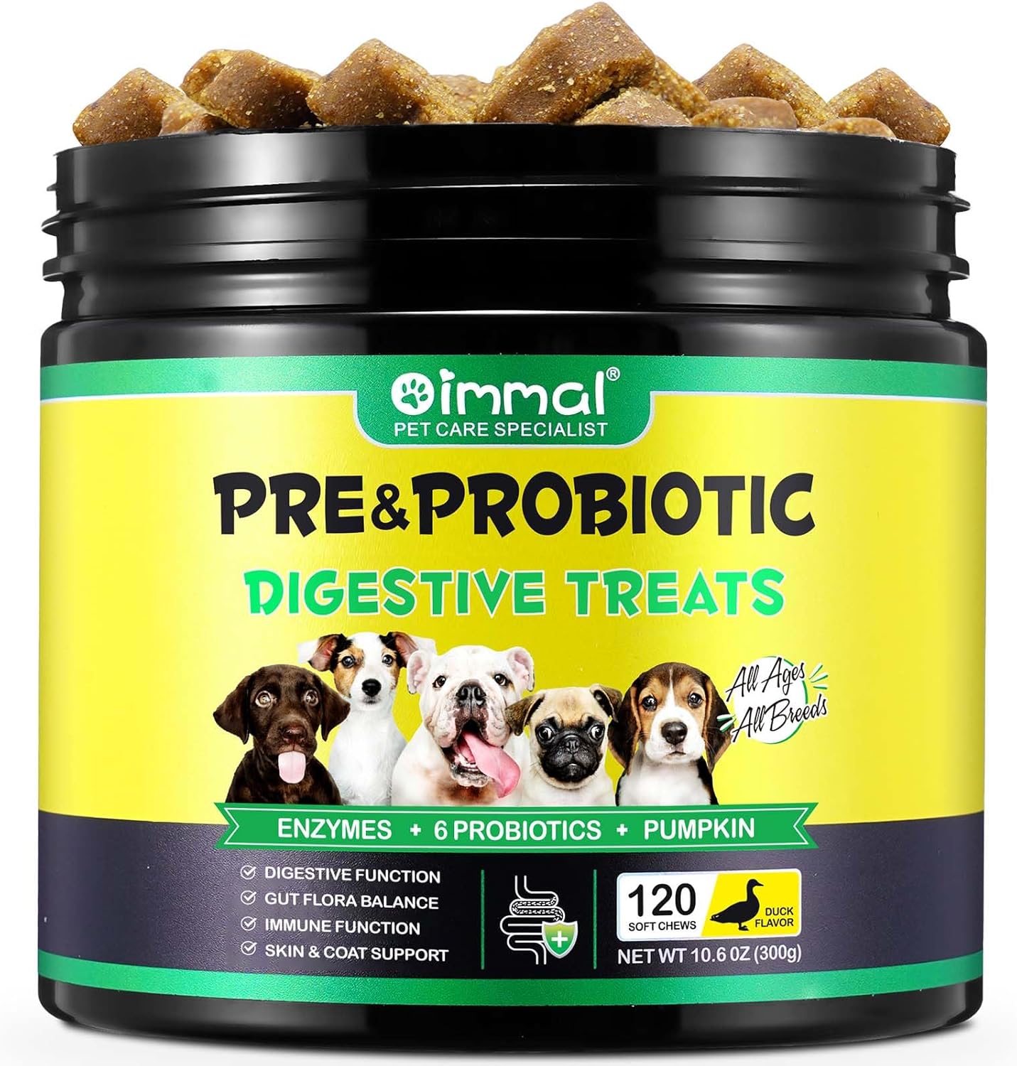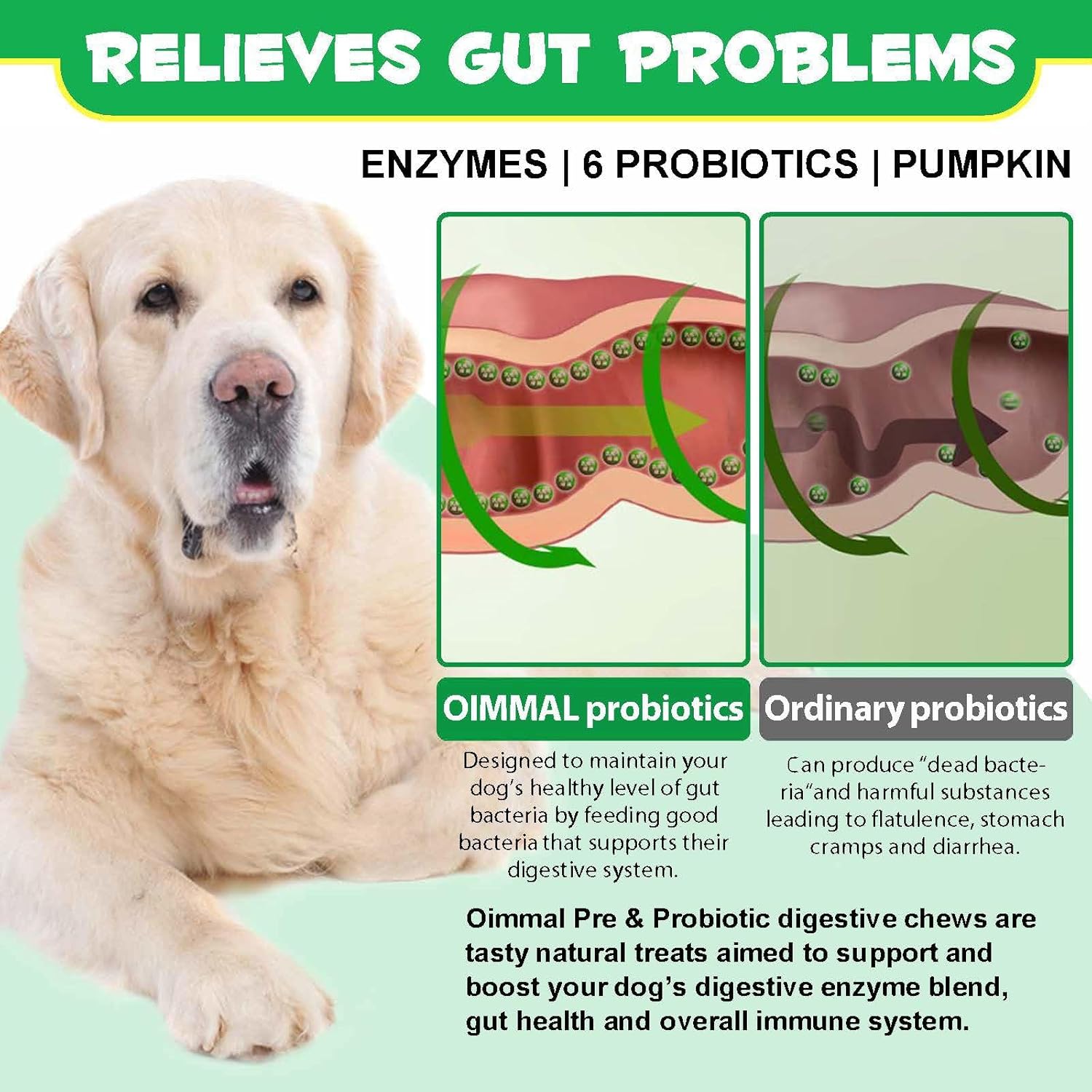 - Digestive chews with pre‑ and postbiotics designed to promote beneficial gut bacteria