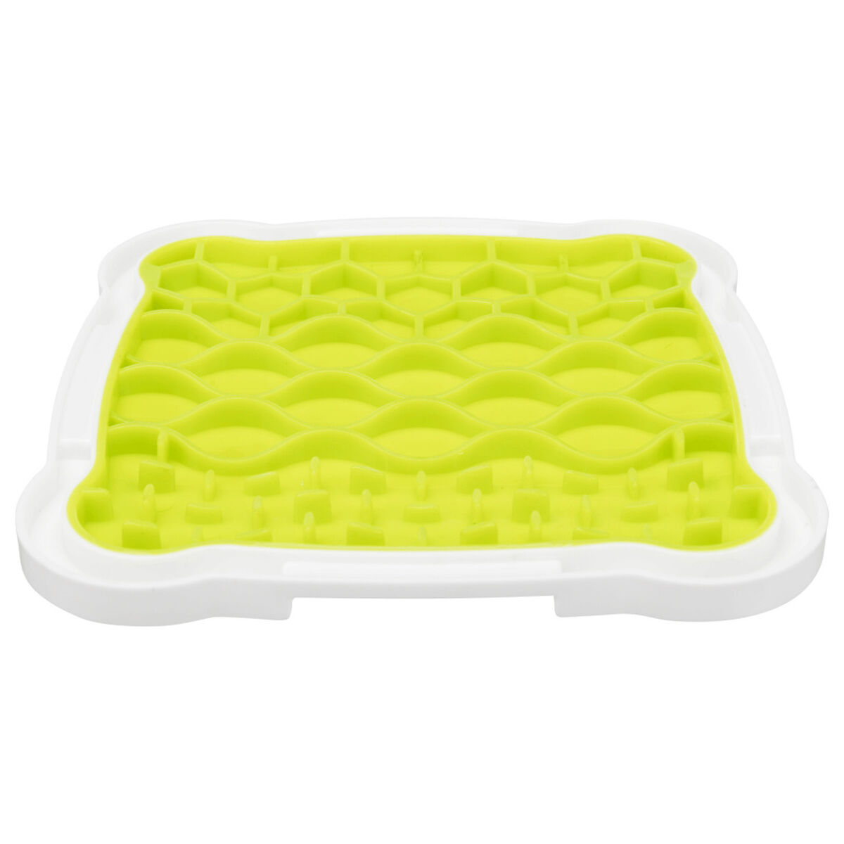 The pet feeder from the Trixie brand features a functional and practical design in an attractive green color, with approximate dimensions of 20 × 20 cm, ideal for small and medium-sized dogs and cats. It is made from durable and safe materials, combining thermoplastic rubber (TPR) and plastic, providing a sturdy and pleasant texture for the pet. This feeder has a design specially created to promote the animal’s well-being, as its structure allows it to be filled with cream treats, wet food, or dairy products, facilitating feeding and entertainment. Its cooling function is particularly notable, since it can be filled with snacks and then frozen, offering a refreshing and stimulating surprise for the pet during long activity periods. Additionally, it features a liquid-retaining edge that prevents spills and keeps the feeding area clean. Another important aspect is the inclusion of non-slip corners, which ensure the feeder’s stability during use, providing safety and comfort for both the pet and the owner. This product is designed to reduce fast snack intake and encourage calm and relaxed moments through licking, contributing to more controlled and peaceful behavior. Overall, the Trixie feeder combines quality materials and a design aimed at healthy animal interaction, offering a practical and versatile solution among pet accessories.